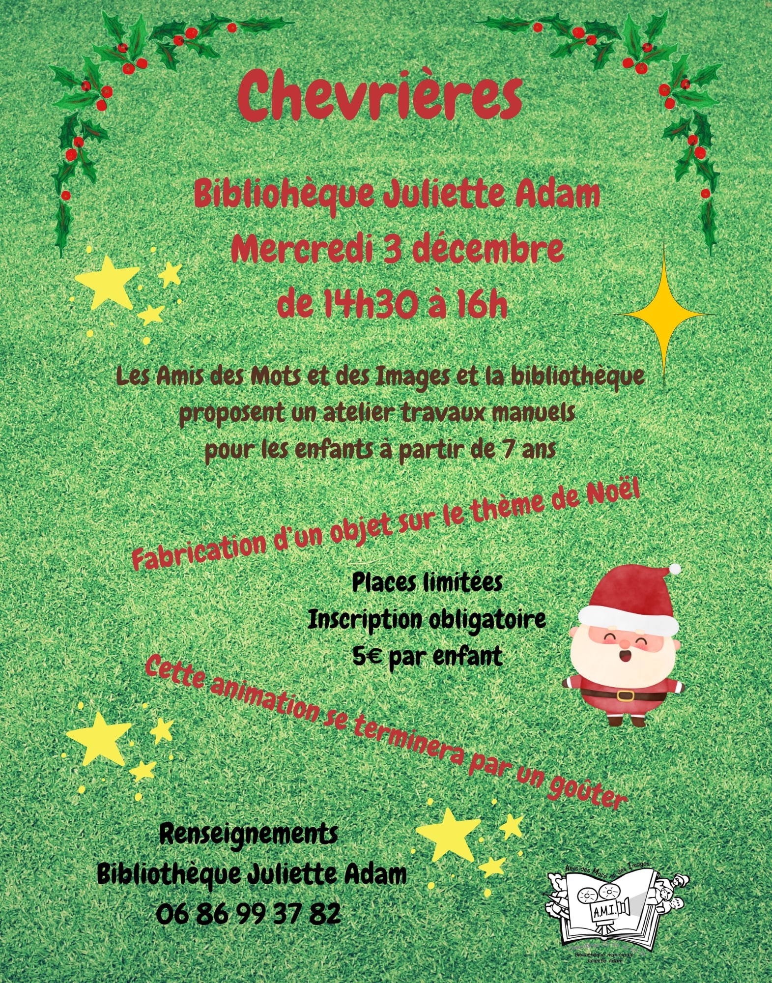 « Tous les Évènements Fabrication d’un objet sur le thème de Noël (à partir de 7 ans) mer 12 | 14:30 « Vente de Noël Spectacle Poussière à partir de 9 ans (Réservation conseillée) » Ajouter au calendrier Google Agenda iCalendar Outlook 365 Outlook Live Détails Date : mer 12 Heure : 14:30 - 16:00 Lieu Bibliothèque Juliette Adam 77 rue de Beauvais Chevrières, 60710 Voir Lieu site web Organisateur Amis des Mots et des Images et Bibliothèque Juliette Adam Téléphone 06 86 99 37 82