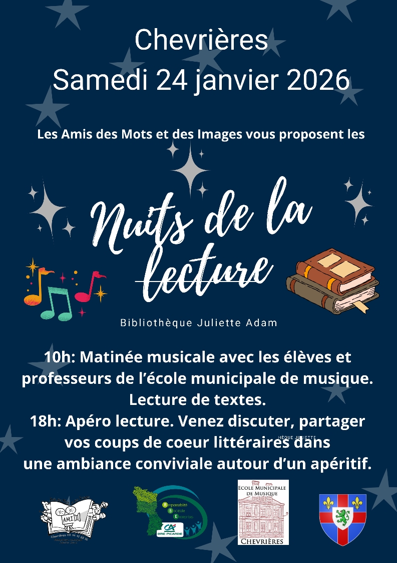 « Tous les Évènements Nuits de la lecture – Matinée musicale sam 01 | 10:00 « Cérémonie des Vœux 2026 Nuits de la lecture – Apéro lecture » Ajouter au calendrier Google Agenda iCalendar Outlook 365 Outlook Live Détails Date : sam 01 Heure : 10:00 Lieu Bibliothèque Juliette Adam 77 rue de Beauvais Chevrières, 60710 Voir Lieu site web Organisateur Amis des Mots et des Images