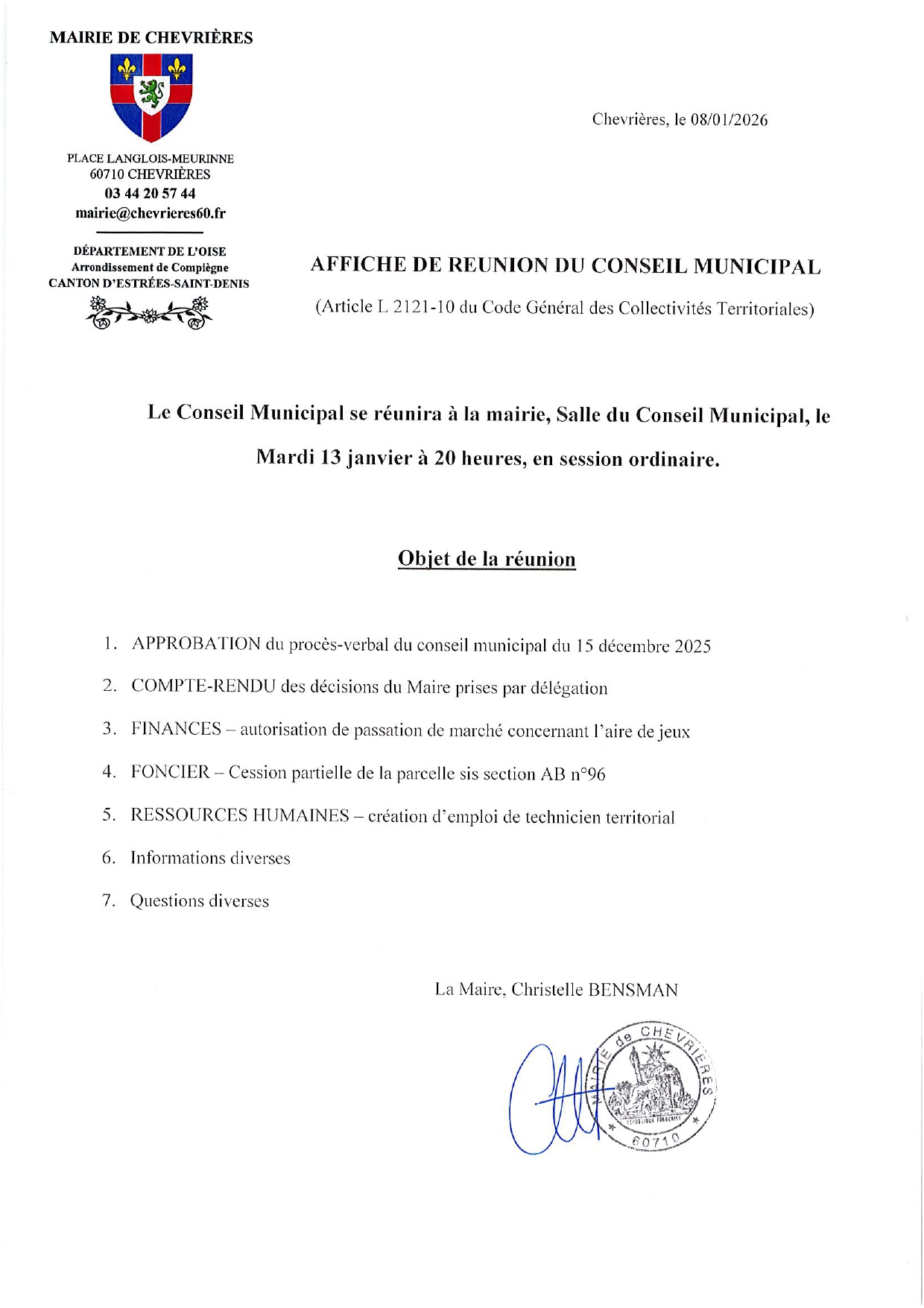 « Tous les Évènements Réunion du conseil municipal mar 01 | 20:00 « Ciné Débat – Elle entend pas la moto Cérémonie des Vœux 2026 » Ajouter au calendrier Google Agenda iCalendar Outlook 365 Outlook Live Détails Date : mar 01 Heure : 20:00 Lieu Mairie – Salle du conseil municipal Place René Langlois-Meurinne Chevrières, 60710 Organisateur Mairie Téléphone 03 44 20 57 44