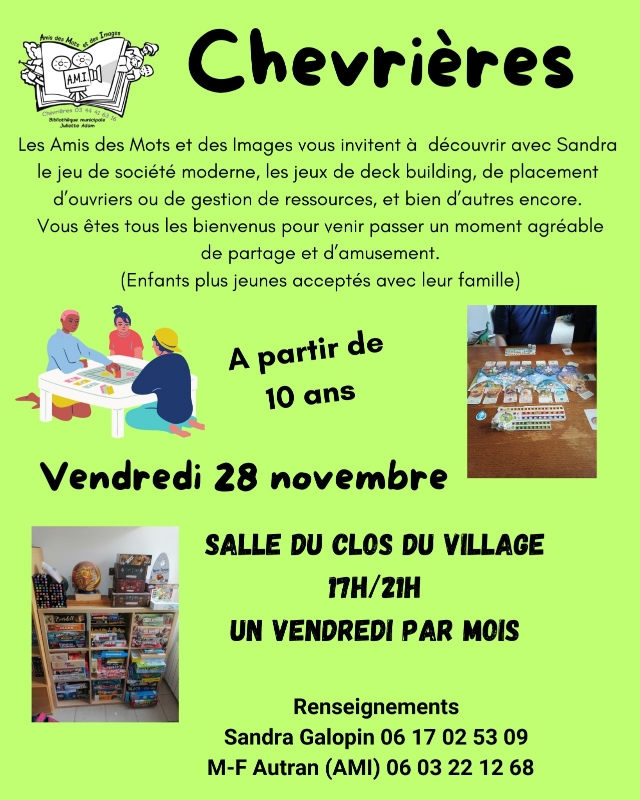 « Tous les Évènements Soirée jeux de société à partir de 10 ans ven 11 | 17:00 « Vente de Noël Vente de Noël » Ajouter au calendrier Google Agenda iCalendar Outlook 365 Outlook Live Détails Date : ven 11 Heure : 17:00 - 21:00 Lieu Salle « Le Clos du Village » rue Le Clos du Village Chevrières, 60710 Organisateur Amis des Mots et des Images
