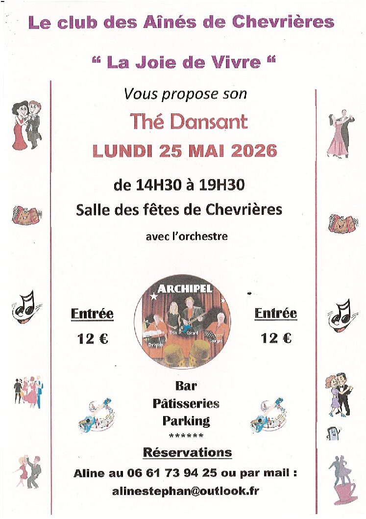 « Tous les Évènements Thé dansant lun 05 | 14:30 « À la découverte des oiseaux du village À la découverte des papillons » Ajouter au calendrier Google Agenda iCalendar Outlook 365 Outlook Live Détails Date : lun 05 Heure : 14:30 - 19:30 Lieu Salle municipale de Chevrières 999 rue de Beauvais Chevrières, 60710 France Organisateur Le club des ainés de Chevrières « La Joie de Vivre » Téléphone 03 44 41 69 21